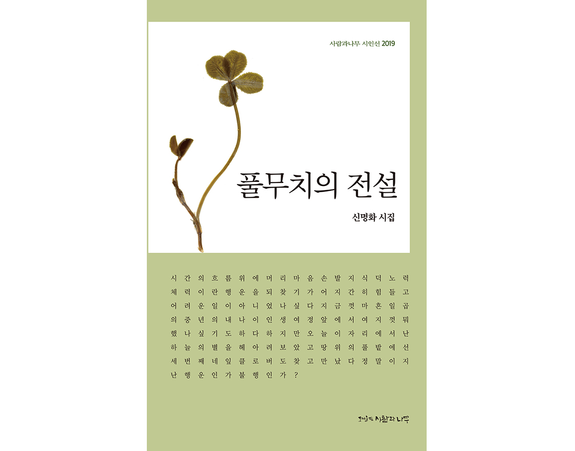 신명화 1969년 경남 하동에서 태어나고 유년기를 보냈다. 경주 동국대 국문학과를 졸업했으며, 동아리 ‘시선’ 동인으로 작품활동을 시작하면서 시와 문학에 관심을 더 갖게 되었다. 학교 졸업 후 고향에서 주경야독으로 틈틈이 글을 썼다. 지금에서야 첫시집 『풀무치의 전설』을 세상에 선보이며, 미완의 서정적 시편들을 미력하나마 엮어내게 되었다. •이메일 smh75695125@gmail.com