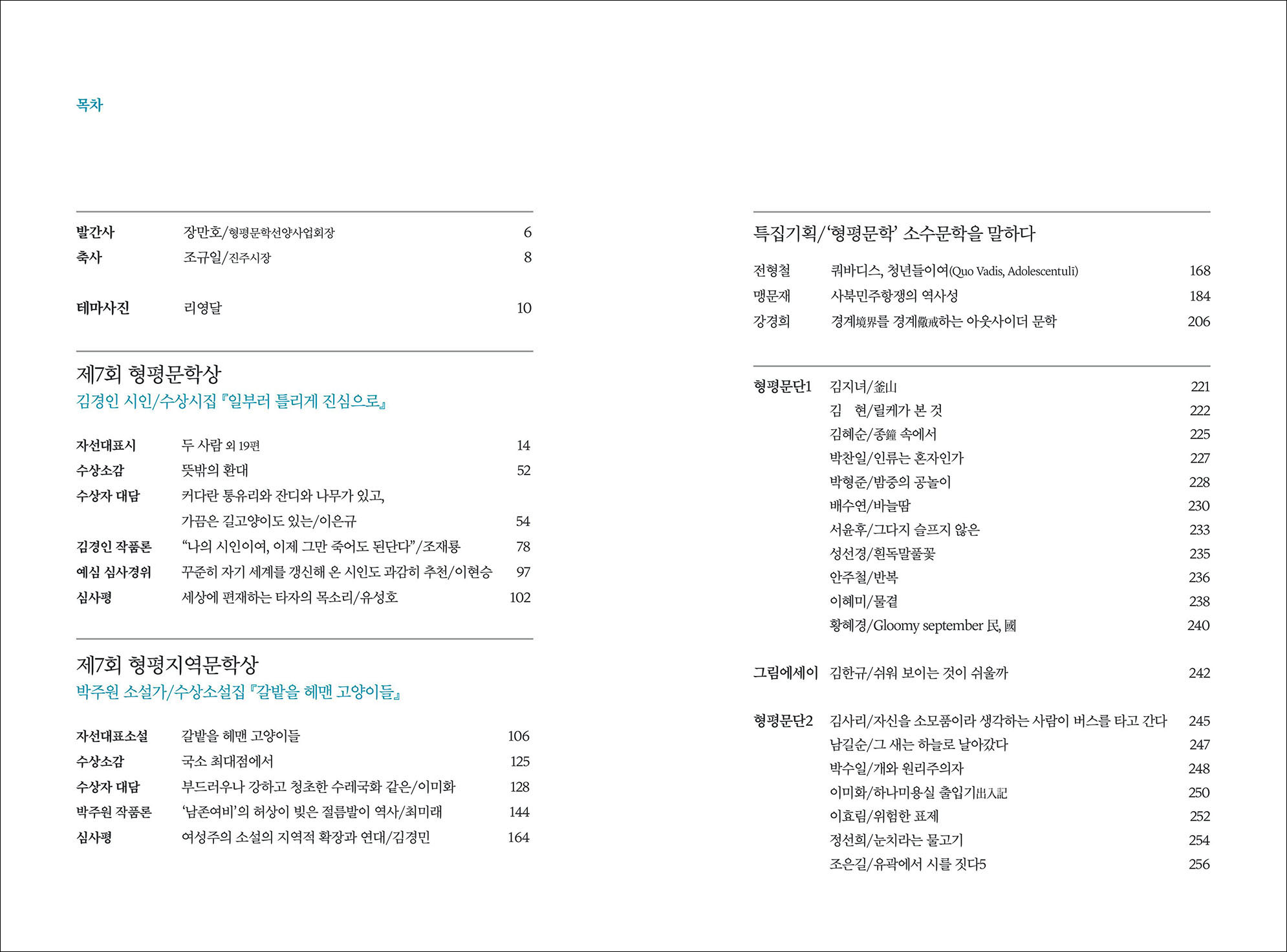 형평운동의 가치에 대한 존숭과 문학에 대한 열정만으로 모든 준비를 해오신 형평문학선양사업회원들에게 깊은 감사를 드립니다. 더불어 형평문학상이 한국문단의 발전에 이바지할 수 있도록 소중한 뒷받침을 해주시는 진주시에 깊이 감사드립니다.