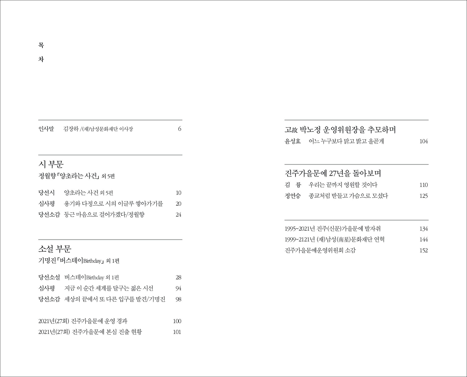 27년간 진주가을문예를 통해 많은 인연들을 만났습니다. 수상자들이 울면서 소감을 밝히던 모습이 눈에 선합니다. 수상자들이 가족처럼 우애 있게 지내는 걸 보고 또 다른 가슴 뿌듯함을 느꼈습니다. 전국 내로라하는 문인들이 진주가을문예에 보내는 애정도 컸다고 여겨집니다.