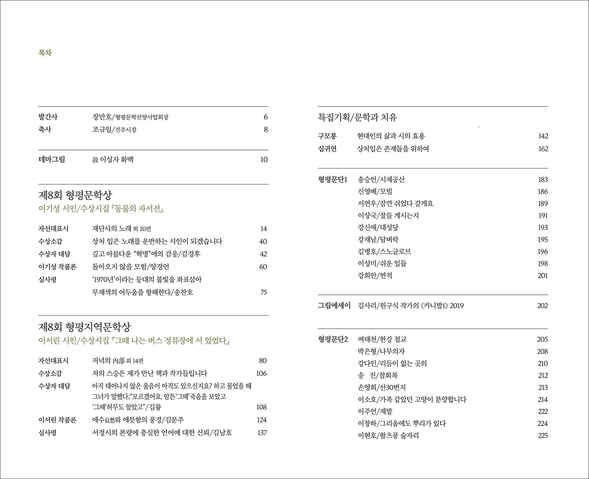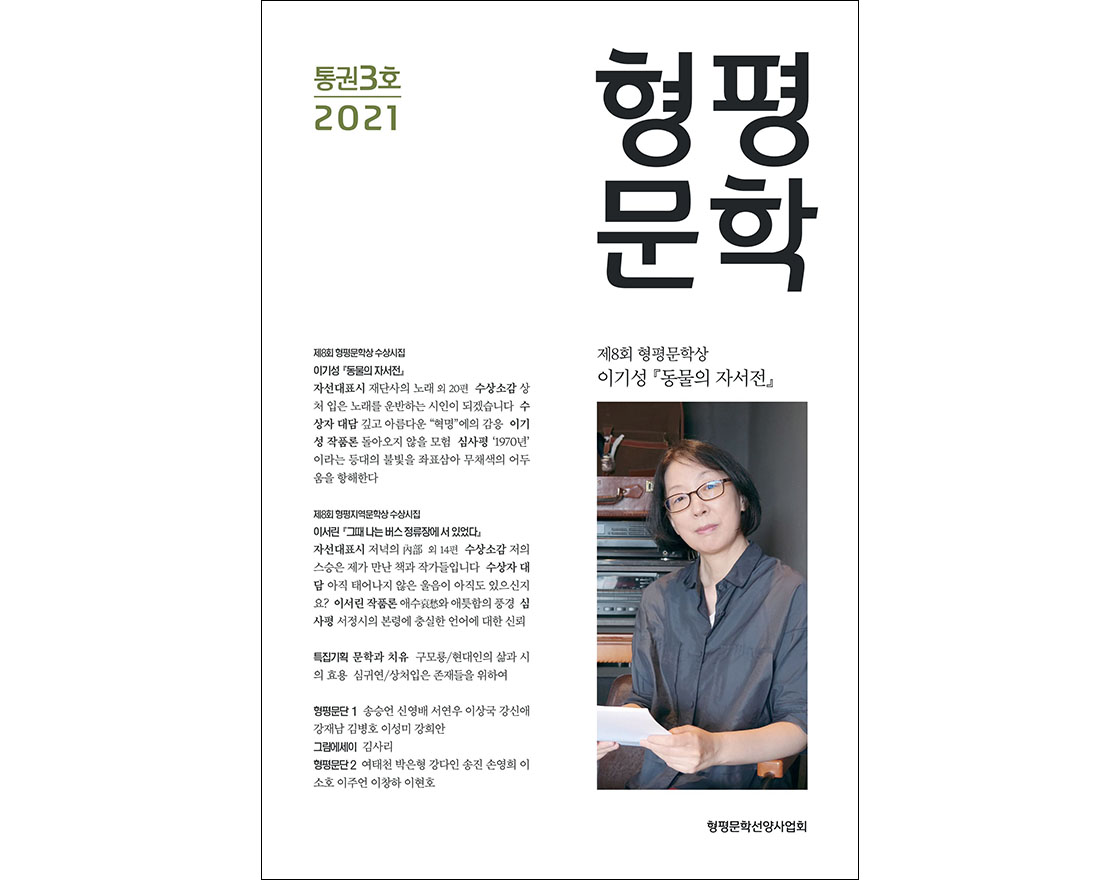 올해 8회를 맞이하는 형평문학상의 수상자는 이기성 시인입니다. 이기성 시인은 이번 시집 『동물의 자서전』을 통해 1970년대의 사회를 아프게 소환함으로써 우리들의 현재와 인간적인 삶의 본질을 묻고 있습니다. 심사평의 말씀처럼 “삶을 탐구하는 치열한 시적 태도가 억압된 제도와 질서로부터 인간의 구원이라는 형평운동의 정신에도 부합”하는 시를 써오신 이기성 시인의 형평문학상 수상을 기쁜 마음으로 축하드리며 앞으로의 시작을 통해 형평문학상의 가치를 더욱 높여주시기를 부탁드립니다. 또한 제8회 형평지역문학상을 수상하신 이서린 시인은 개인적 삶에 대한 오랜 성찰과 자기반성을 감각적이고 서정적인 언어로 형상화하고 있습니다. 이번 상이 그간의 고군분투에 드리는 작은 위로가 되기를 바라마지 않습니다.